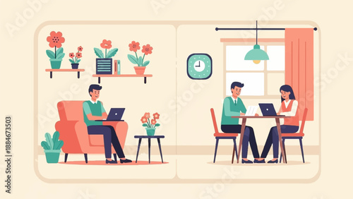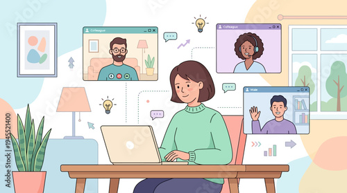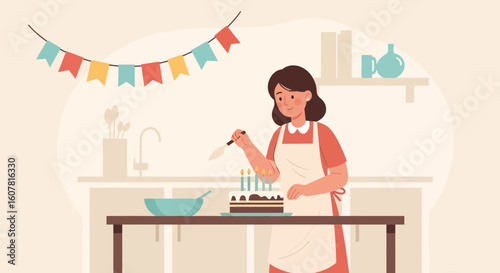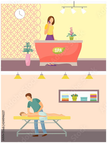 Парфюмерный магазин. Продавщица, стоящая за прилавком, плоская векторная иллюстрация. Парфюмерия, интерьер универмага с полками, полными флаконов духов.