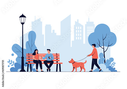 Счастливые люди, гуляющие с собаками в городском парке, векторная иллюстрация. Владельцы собак мужского и женского пола со своими питомцами. Концепция любви к домашним животным для веб-баннера, страницы веб-сайта и т.д.
