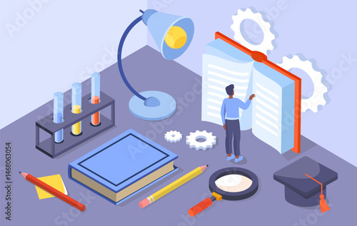 Концепция аптечного магазина с персонажами и различными видами лекарств, предметов медицинского назначения, векторная иллюстрация. 3d изометрические таблетки и флаконы для лекарств, маска для лица, шприц. Аптека, магазин медицинской клиники.