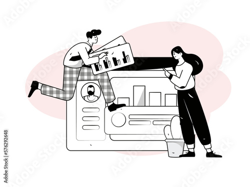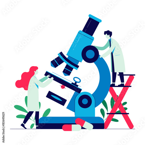 Векторная иллюстрация большого микроскопа и фармацевтов, ученых, работающих в лаборатории. Фармакологический бизнес, аптечное лабораторное оборудование, концепция фармацевтической промышленности для веб-баннера, страницы веб-сайта.