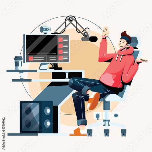 Фотограф, снимающий молодую девушку и милую домашнюю собаку профессиональной камерой в студии, плоская векторная иллюстрация. Профессия фотографа. Фотосессия.