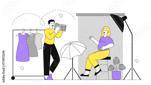 Фотограф фотографирует женскую модель, любящую пару, домашнюю собаку, счастливую семью, футболки, мужскую одежду, плоскую векторную изолированную иллюстрацию. Профессия фотографа, фотосессия в студии.