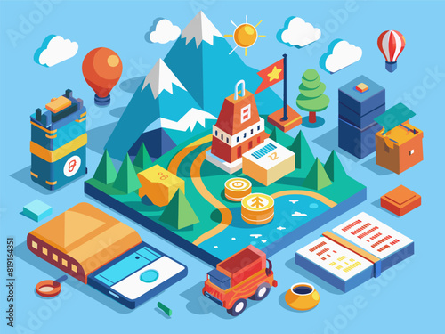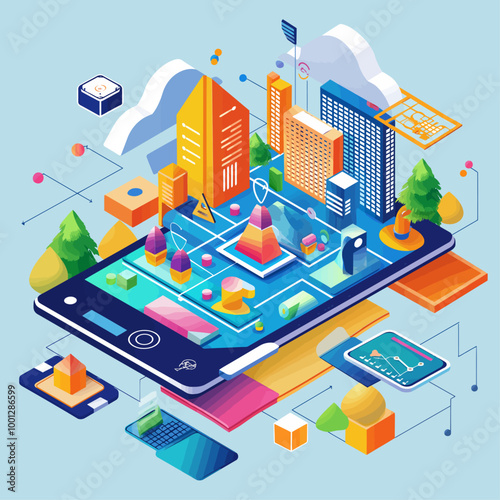 Пикник в парке изометрические объекты на экране мобильного телефона. Векторная иллюстрация в плоском 3d-стиле. Оставайтесь онлайн везде, где есть концептуальная иллюстрация.