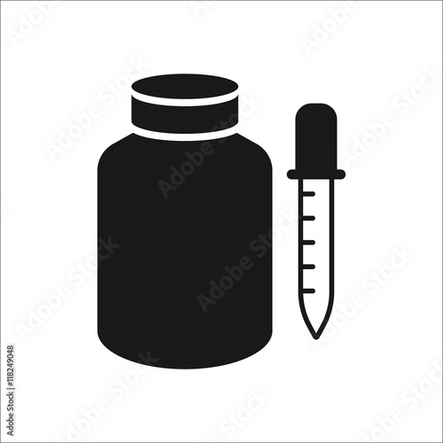 Значок флакона с таблетками. Вектор баночки с витаминами. Пластиковый контейнер для пищевых добавок, выделенный на белом фоне. Символ медицины, аптеки или зоомагазина ветеринара