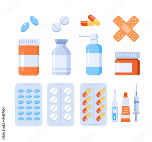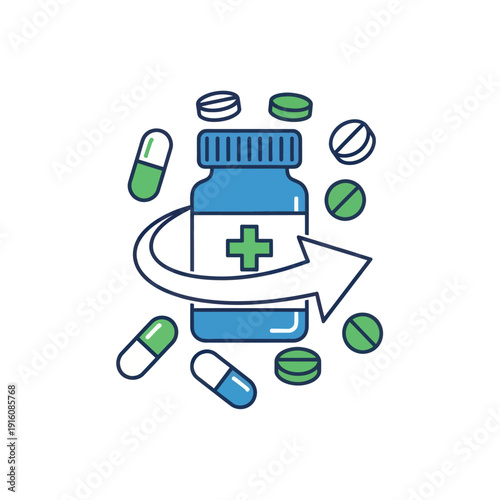 Таблетки в блистере и бутылке, жидкие лекарственные средства с медицинским векторным плакатом shield. Иллюстрация фармацевтической защиты от антибиотиков