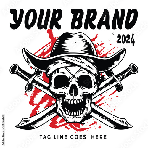Пиратский капитан череп и скрещенные мечи векторный эскиз гранж иллюстрация. Человеческий череп в пиратской шляпе и повязке на глазу. Винтажный логотип, дизайн шаблона татуировки.