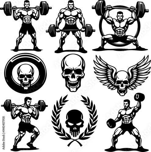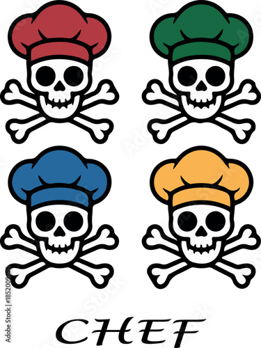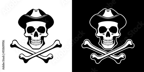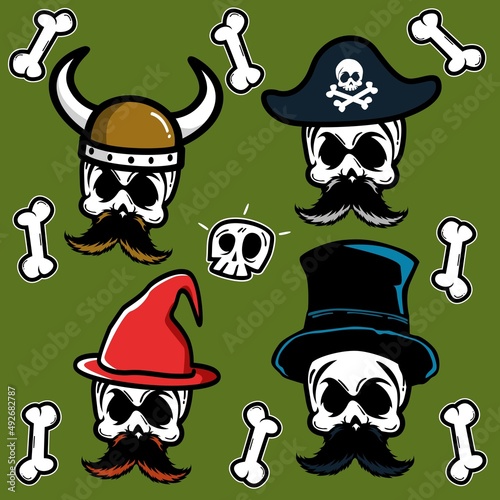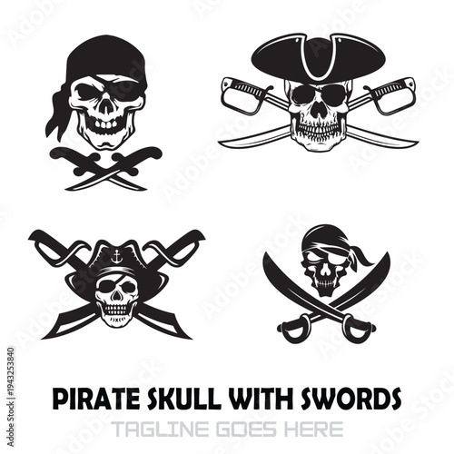Набор пиратских черепов, векторная рисованная иллюстрация, изолированная на белом фоне. Человеческий череп со скрещенными мечами и костями, в шляпе пиратского капитана, бандане, повязке на глазу. Винтажная графика на футболке с татуировками