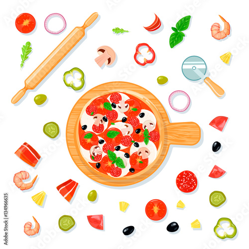 Ингредиенты для пиццы. Тесто, салями, грибы, оливки, перец, помидоры, руккола, зелень петрушки и розмарина, векторная иллюстрация вида сверху. Итальянская пицца для пиццерий и ресторанов по меню, книга рецептов.