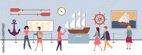 Планетарий, декорации космического музея, плоская векторная иллюстрация. Люди смотрят на ночное небо, планеты солнечной системы, звезды, небесные тела в телескоп, слушают гида. Образование в области астрономии.