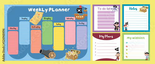 Векторный шаблон календаря планировщика с милыми космическими животными пандой, енотом, кошкой, лисой, ракетами, планетами, созвездиями. Органайзер и расписание с местом для заметок.