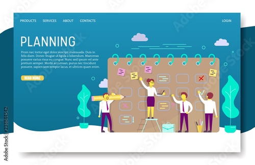 Планирование шаблона веб-сайта целевой страницы. Векторная иллюстрация бизнес-команды офисных сотрудников, планирующих свою повседневную рутинную работу. Календарь с наклейками, галочками. Концепция временной шкалы расписания планирования.