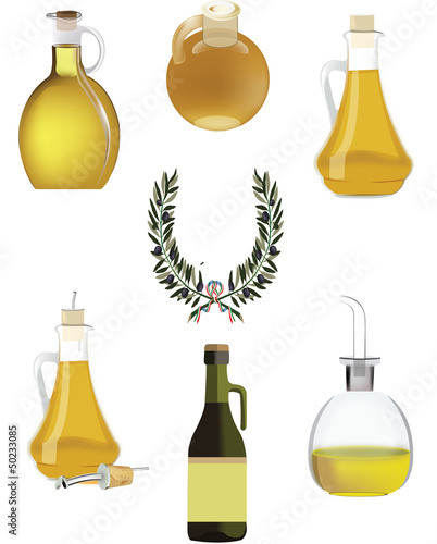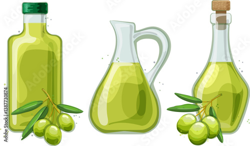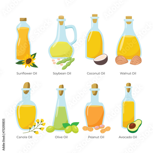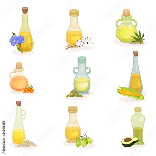 Различные типы набора бутылок для растительного масла. Векторная реалистичная иллюстрация стеклянных бутылок с соевым, оливковым, подсолнечным и горчичным маслом. Натуральные ингредиенты для приготовления пищи.