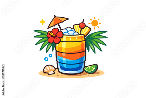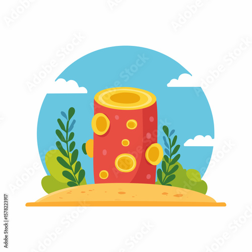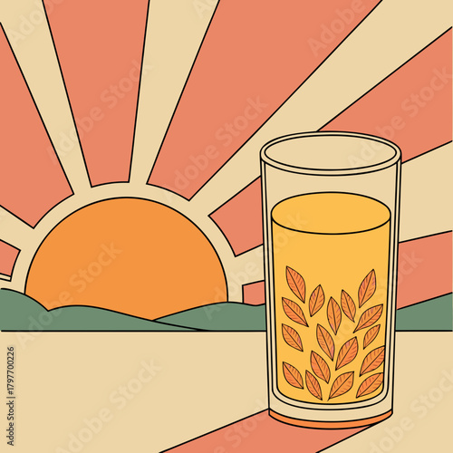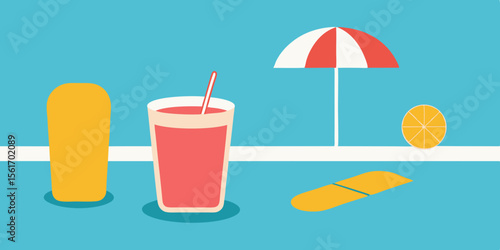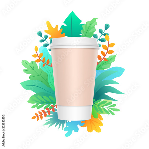 Кофе навынос, шаблон рекламы чайной чашки, векторная иллюстрация. Пустой пластиковый одноразовый стаканчик, реалистичный макет на выставочном подиуме, вырезанный из бумаги осенний фон с красными и желтыми листьями, зонтик.