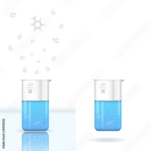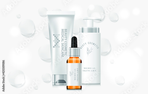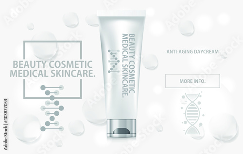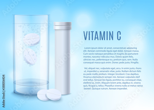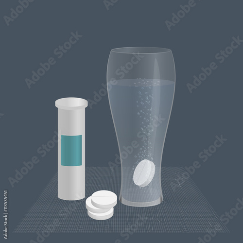 Пластиковый тюбик витаминных таблеток с макетом крышки, стакан воды с шипучей таблеткой и сверкающими пузырьками, векторная иллюстрация. Шипучие растворимые таблетки.
