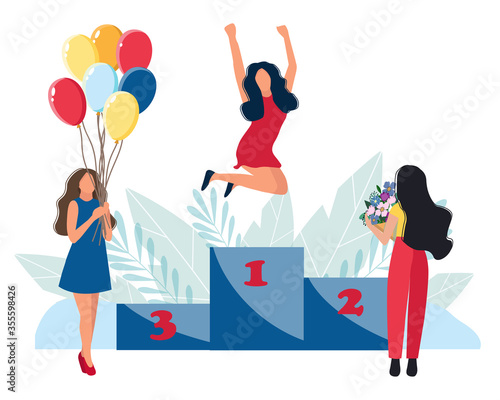 Игрок в гольф размахивает клюшкой, победитель чемпионата стоит на пьедестале, векторная иллюстрация. Игра в гольф соревновательный вид спорта, концепция хобби для веб-баннера, страницы веб-сайта и т.д.