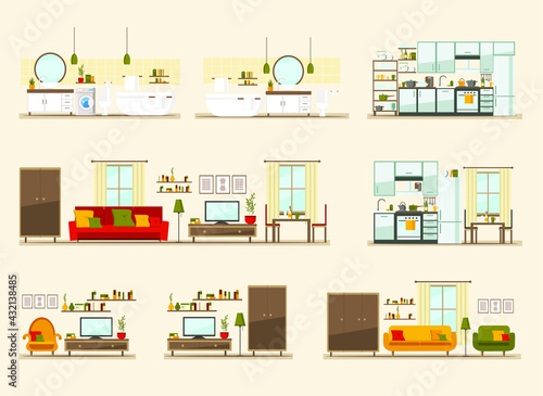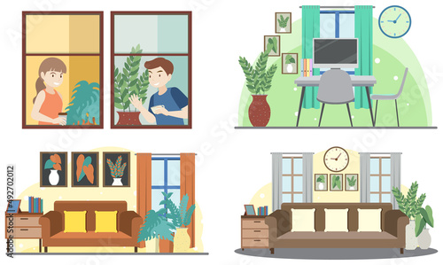Векторный набор плакатов, баннеров с грузчиками, несущими диван, телевизор, толкающими тележку с холодильником, сантехником, чинящим протекающие водопроводные трубы. Сантехника, услуги компании по переезду или доставке элементов дизайна в плоском стиле.