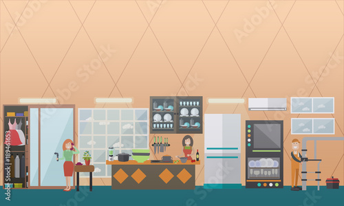 Векторная иллюстрация монтажника труб или сантехника, фиксирующего протекающие водопроводные трубы с помощью трубного ключа, женщина со сломанной трубой, вызывающая аварийную службу. Концепция сантехнических услуг элементы дизайна в плоском стиле.