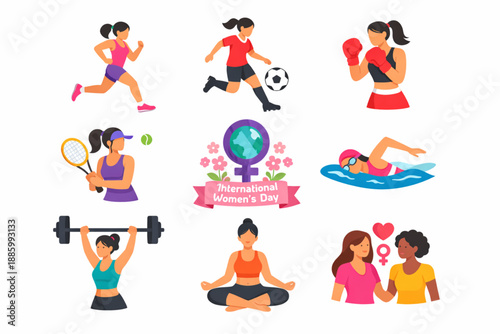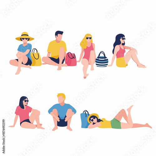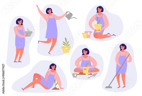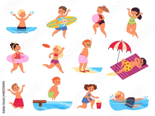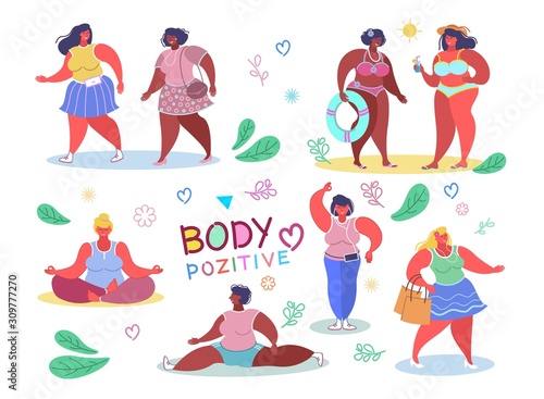 Счастливые разнообразные женщины больших размеров в летней одежде гуляют, танцуют, загорают, сидят в позе йоги, тренируются, ходят по магазинам, векторная плоская иллюстрация, изолированная на белом фоне. Концепция позитивного тела.