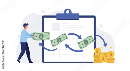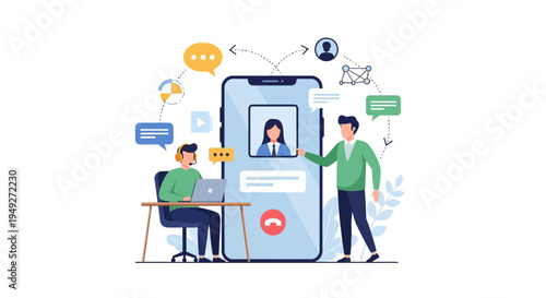 Иллюстрация дизайна векторного плоского стиля подкаста. Большой смартфон и крошечные люди, слушающие аудиопрограммы подкастов на мобильном телефоне, ноутбуке, портативном медиаплеере.