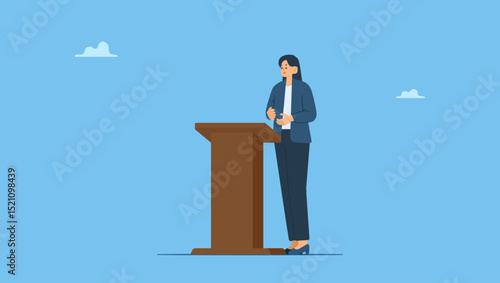 Политик, оратор, женщина-кандидат, выступающая с трибуны с поднятой рукой, векторная плоская изолированная иллюстрация. Предвыборная кампания, публичные выступления, политические встречи и предвыборные выступления.