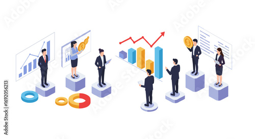 Схема Понци, мошенническая инвестиционная афера, плоская векторная изометрическая иллюстрация. Схема финансовой пирамиды. МЛМ, многоуровневый маркетинг, сетевой маркетинг.