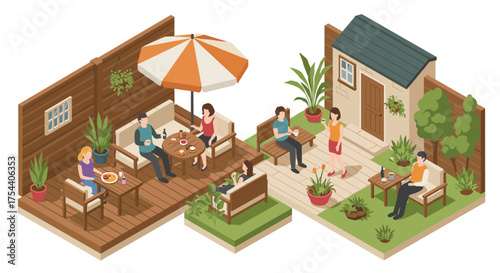 Набор векторных иллюстраций для вечеринки у бассейна. Летний отдых у бассейна. Счастливые люди плавают в бассейне, пьют и танцуют. Вечеринка у бассейна с диджеем.