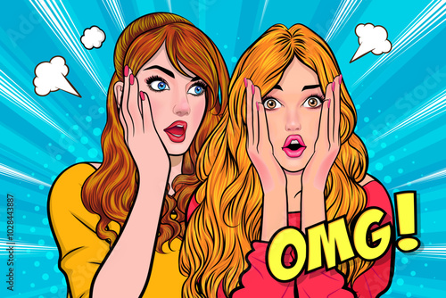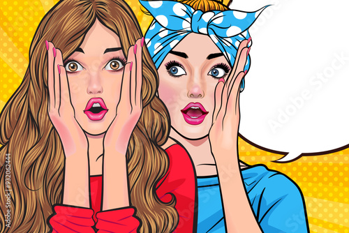 Векторная иллюстрация ретро-комиксов в стиле поп-арт. Женщина шепчет сплетни или секреты своей подруге. Речевой пузырь.