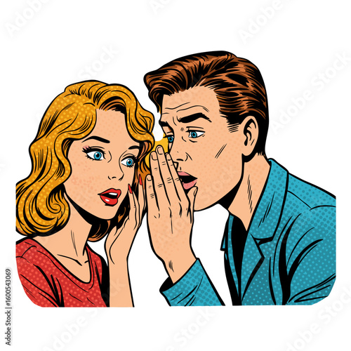 Векторная иллюстрация ретро-комиксов в стиле поп-арт. Женщина шепчет сплетни или секреты своей подруге. Речевой пузырь.