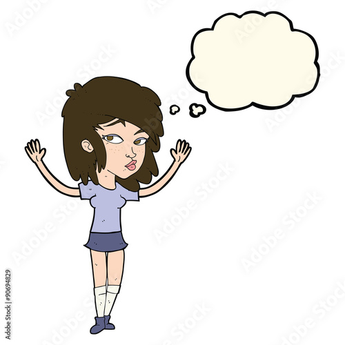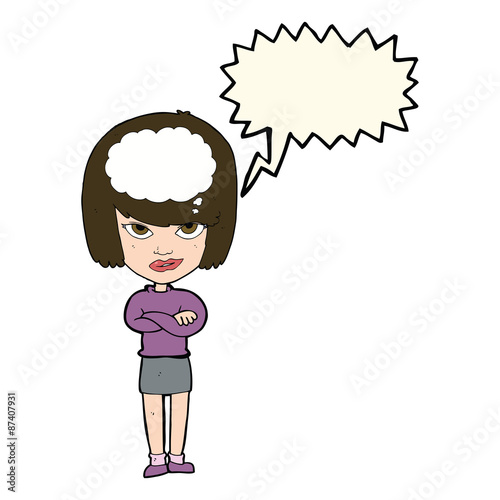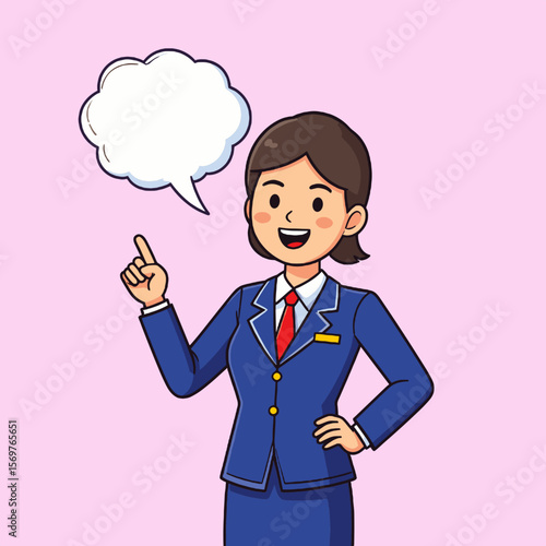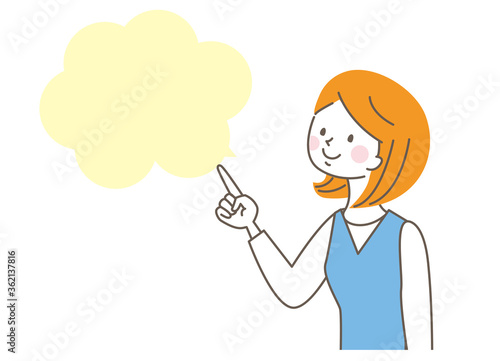 Женщина в стиле поп-арт в стиле ретро указывает рукой на знак с речевым пузырем. Комическая рисованная векторная иллюстрация дизайна.