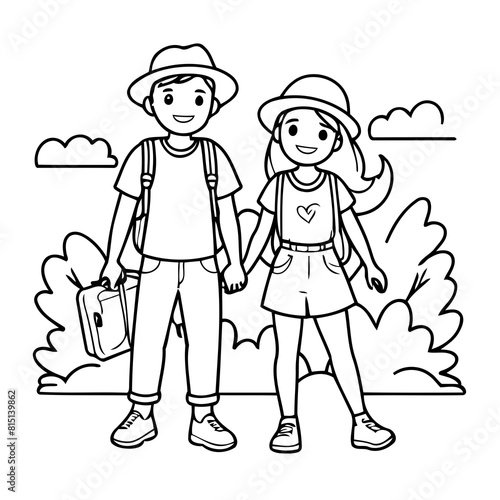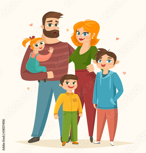 Портрет счастливой семьи с детьми, путешествующей с рюкзаком. Улыбающиеся мать, отец и дети улыбаются и наслаждаются пикником на открытом воздухе, скаутингом или приключенческой поездкой в отпуск