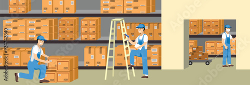 Векторные плакаты концепции почтового отделения. Служба доставки, почтальон, курьер доставляет почту в почтовый ящик. Люди работают на складе. Женщина отдает посылку клиенту в почтовом отделении.