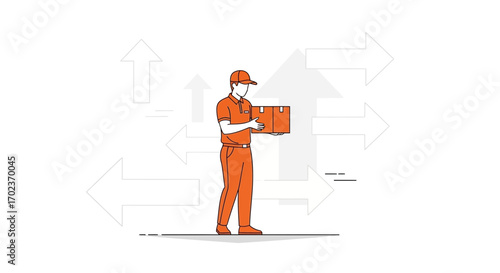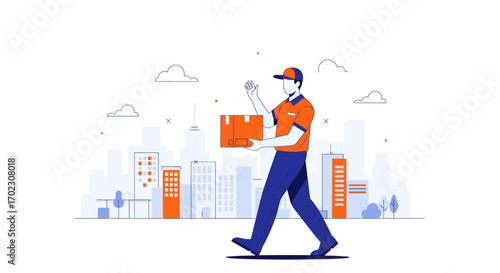 Молодой человек-курьер, несущий посылку, векторная плоская иллюстрация, изолированная на белом фоне. Курьерские услуги, концепция службы доставки почтовой корреспонденции для веб-баннера, страницы веб-сайта и т.д.