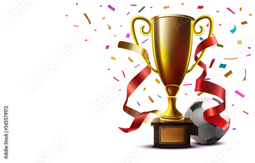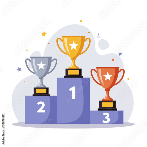 Вызов по пауэрлифтингу, векторная реалистичная иллюстрация. Золотые, серебряные и бронзовые кубки на белом пьедестале почета. Награды победителя на пьедестале победы и тренажеры для занятий со штангой, гантелями и гирей.
