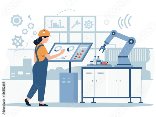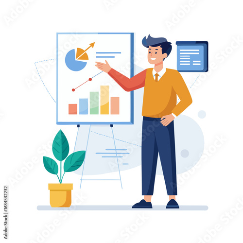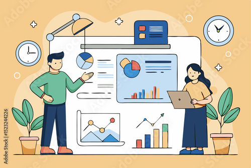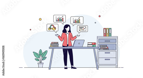 Векторная плоская иллюстрация концепции предвыборной кампании. Леди-кандидат представляет программу своей будущей деятельности, выступая с трибуны перед видеокамерой. Предвыборная речь, встреча с избирателями.
