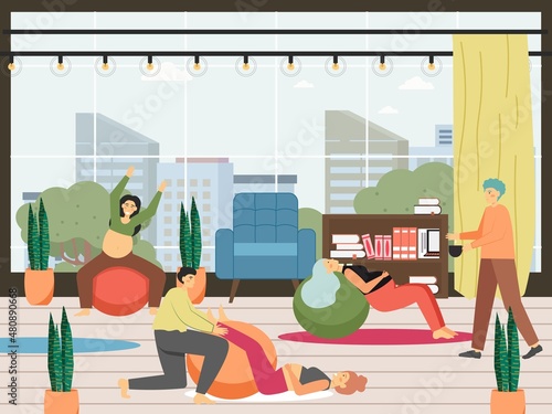 Беременная мама тренажерный зал или домашняя тренировка на фитнес-мяче, плоская векторная иллюстрация. Дородовое здравоохранение, упражнения с мячом для беременных.