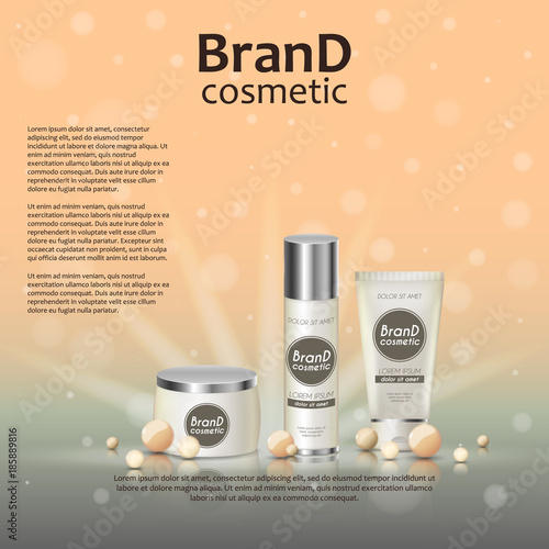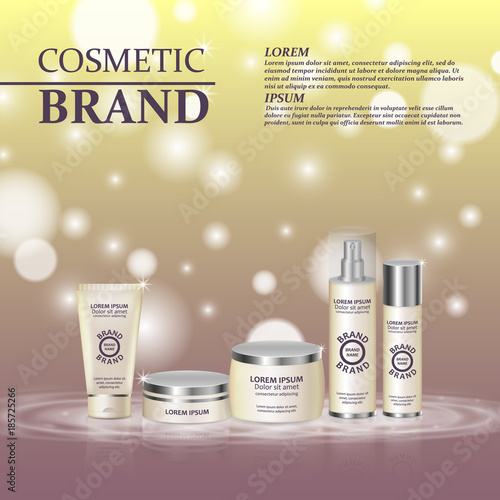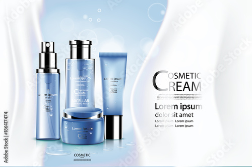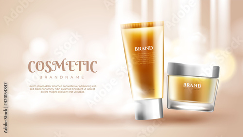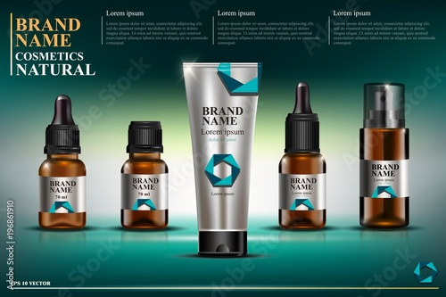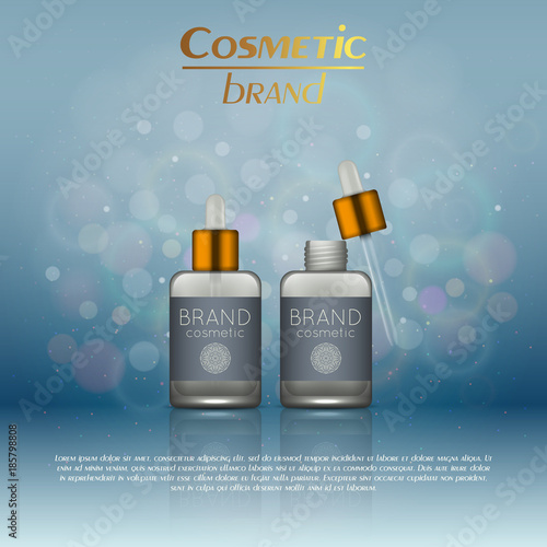 Реклама косметических средств премиум-класса. Векторная 3d иллюстрация. Дизайн шаблона бутылки бренда по уходу за кожей. Крем и лосьон для макияжа лица и тела.