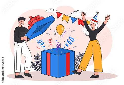 Микро-мужские и женские персонажи упаковывают огромную подарочную коробку с завязанной лентой, векторная иллюстрация. Представьте концепцию веб-баннера, страницы веб-сайта и т.д.
