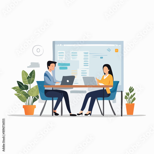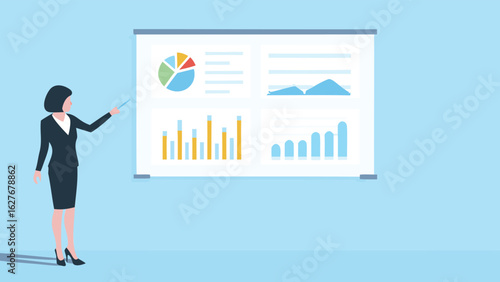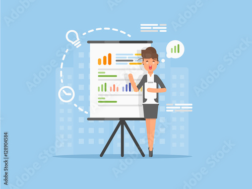 Векторная иллюстрация деловой женщины, дающей презентацию. Женщина-лектор указывает на диаграмму на доске. Дизайн в плоском стиле.