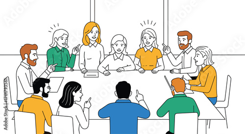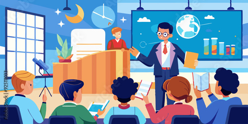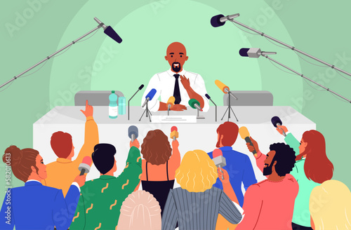 Сцена пресс-конференции. Векторный мужчина-спикер за столом, отвечающий на вопрос интервьюера, выступающего перед журналистами с иллюстрацией микрофонов. Официальная встреча, концепция общения с журналистами