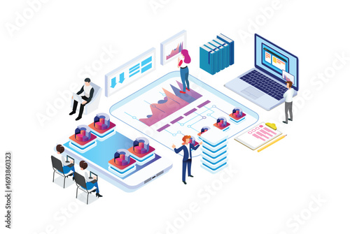 Издательство, типография, копировальный центр, векторная плоская изометрическая иллюстрация. Полиграфия, мгновенная печать и услуги по печати чашек, кружек, футболок на заказ.
