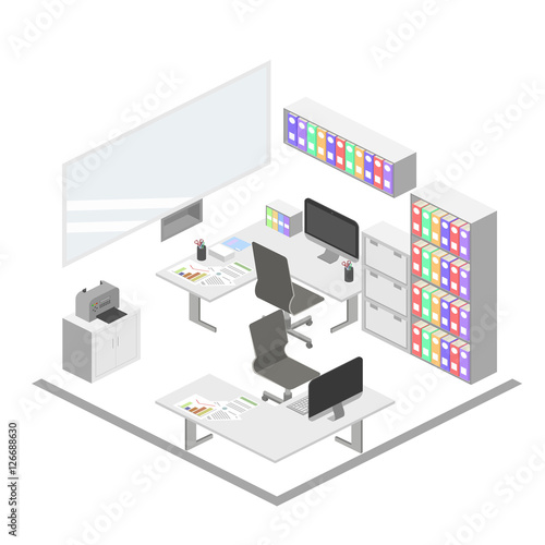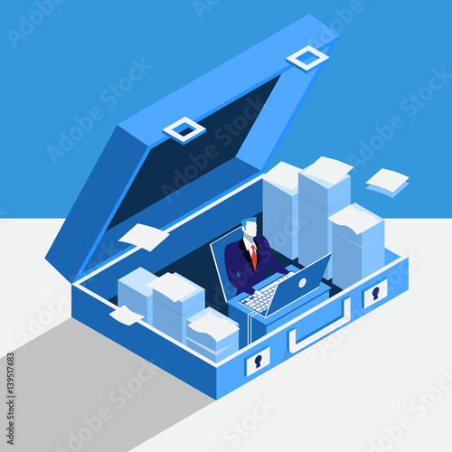 Векторная иллюстрация бизнесмена, работающего за компьютером в личном кабинете, расположенном в портфеле. Дизайн в плоском стиле.