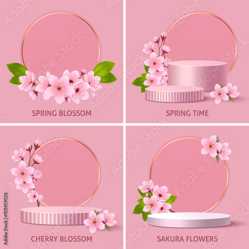 Макет круглого витринного подиума, вырезанные из бумаги весенние цветы и листья, векторная иллюстрация. Весенний цветочный фон, пьедестал, сцена для рекламы косметических средств.
