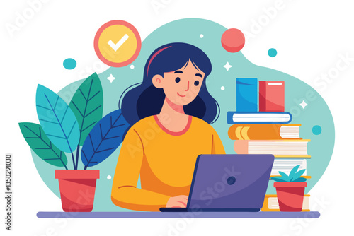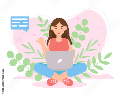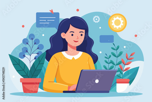 Деловая женщина поливает себя, сидя в цветочном горшке и работая на компьютере, плоская векторная иллюстрация. Профессиональный карьерный рост, успех в бизнесе, планирование карьеры, повышение, личностное развитие