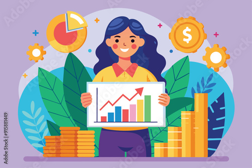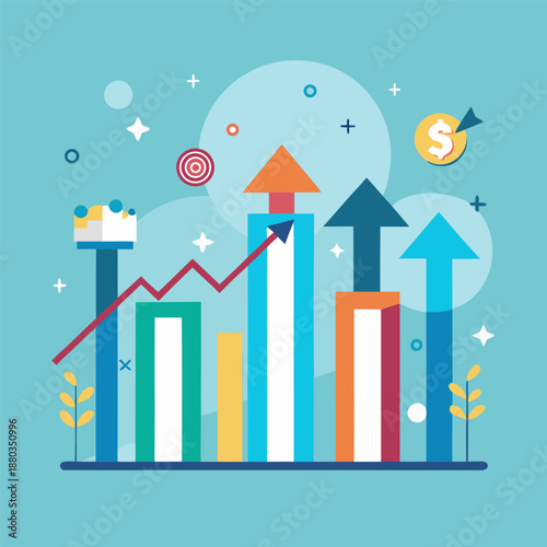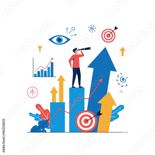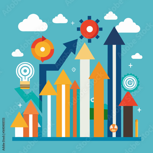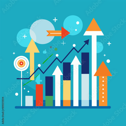 Деловая женщина, стрелки вверх, мишень и летящая ракета, плоская векторная иллюстрация. Профессиональный карьерный рост, успех, запуск бизнес-проекта, планирование карьеры, повышение.