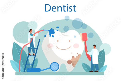Профессиональная стоматологическая помощь, векторная иллюстрация дизайна в плоском стиле. Большой зуб и крошечная женщина в кресле дантиста, доктор с зеркалом дантиста. Медицинский осмотр у стоматолога, лечение зубов, концепция гигиены полости рта.