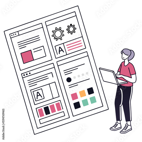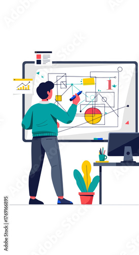 Профессиональный дизайнер представляет подробные чертежи гардероба или шкафа-купе, плоскую векторную иллюстрацию. Концепция дизайна мебели.