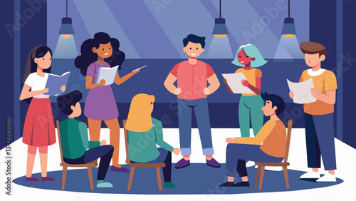 Фотосессия профессионального дизайнера одежды, интервью для средств массовой информации, плоская векторная иллюстрация. Показ мод.