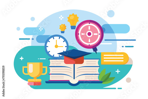 Векторная иллюстрация дизайна в плоском стиле настольного компьютера с человеческим мозгом на мониторе, книгой, глобусом, очками, кошельком с долларовой монетой, компакт-диском. Концепция профессионального программиста для веб-баннера и т.д.