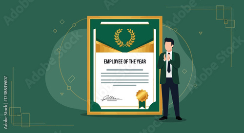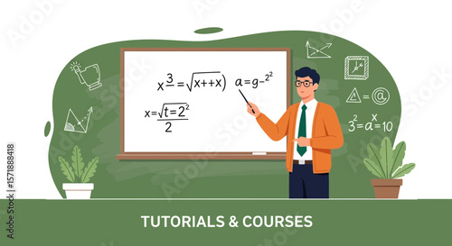 Векторная иллюстрация бизнесмена, дающего презентацию. Лектор-мужчина, указывающий на проекционный экран. Дизайн в плоском стиле.
