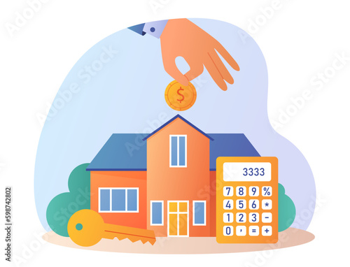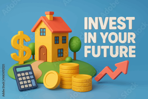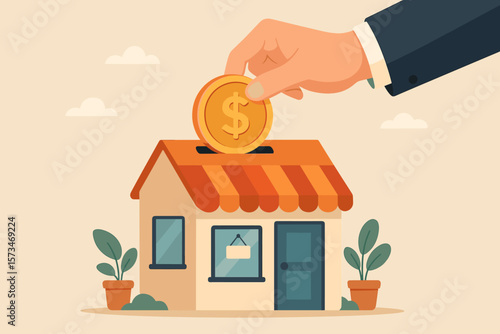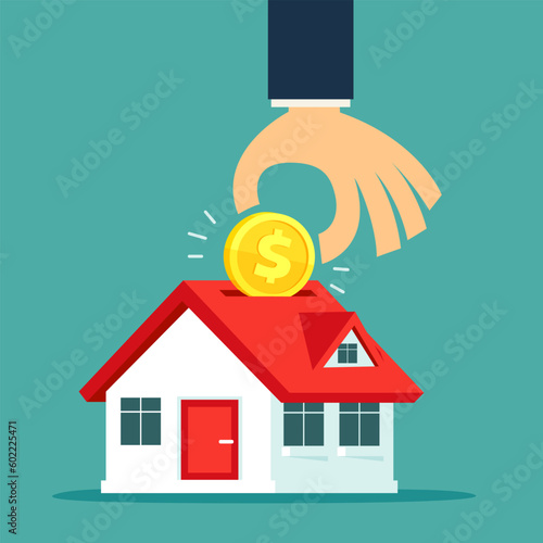 Концепция инвестирования в недвижимость. Инвестиции в недвижимость и недвижимость. Здание расположено рядом со стопкой монет. Символы доллара и элементы дизайна.